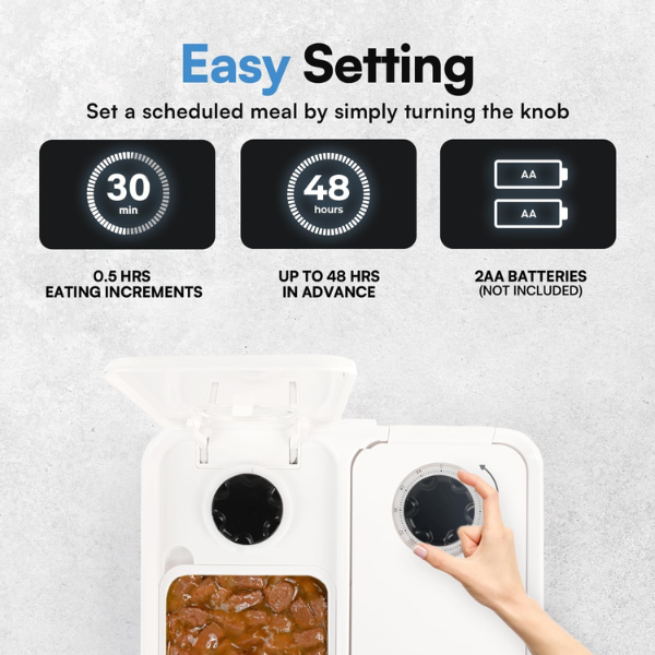- User-Friendly Operation: This 48-hour pet feeder is powered by 2 AA batteries (not included). Simply fill the trays, set the timer, and you’re done! The removable trays are dishwasher safe, making cleanup effortless.