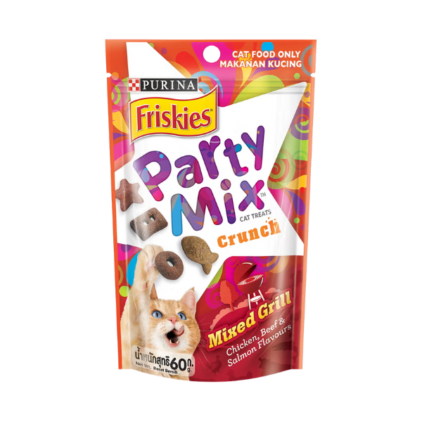 Feed your adult cat 2 treats for each 1 pound of body weight, not to exceed up to 10 treats daily as a reward or tasty snack. Purina Friskies Party Mix Original Crunch provides 100% complete and balanced nutrition for adult cats so that it will not dilute the nutritional value of your cat’s regular maintenance diet. To maintain your cat’s proper weight, reduce the amount of cat food offered proportionately to the amount of snacks you feed your cat.
